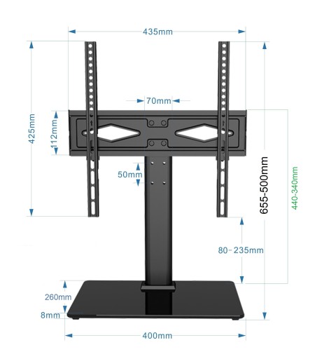 - VESA : 50x50, 75x75, 100x100, 100x200, 200x100, 200x200, 200x300, 300x200, 300x300, 400x200, 400x300, 400x400mm oraz wszystkie pośrednie - prosimy upewnić się że Państwa telewizor ma otwory montażowe w tych przedziałach . Jeżeli otwory montażowe są w jeszcze większym zakresie np. 500x400mm lub 600x400 mm to wtedy odpowiedni będzie stojak ST-06.