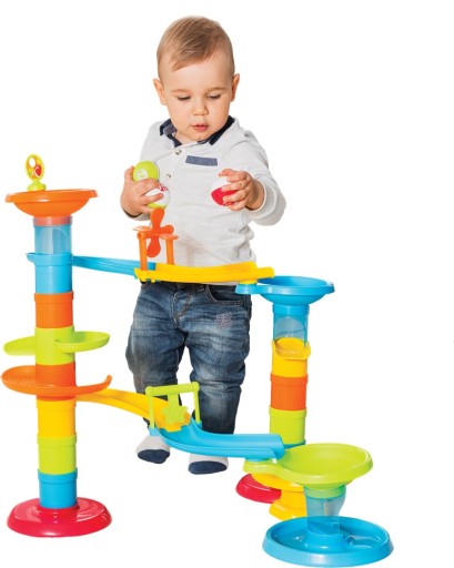 Hop Hop Bęc! Weź udziału w piłeczkowym pościgu i sprawdź, która kuleczka pierwsza dotrze do mety! Zbuduj wielką zjeżdżalnię z dwoma torami wyposażonymi w obrotowe elementy oraz trampolinę podrzucającą spadające piłeczki. Duży rozmiar upodabnia zabawkę do prawdziwej, pełnowymiarowej zjeżdżalni, by zabawa cieszyła podwójnie! Zestaw składa się z 30 elementów, które można dowoli składać i rozkładać.