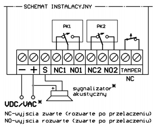 - wyjście sabotażowe sygnalizujące otwarcie obudowy odbiornika (NC)