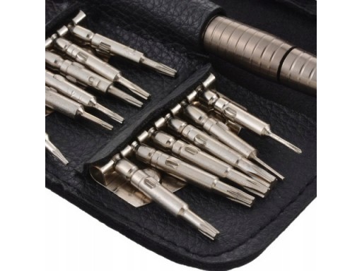 Nie zastąpiony zestaw dla każdego domowego majsterkowicza. Może przydać się każdemu, kto będzie chciał wymienić wyświetlacz, głośnik lub inny podzespół swojego telefonu. W zestawie znajduje się aż 25 różnych końcówek wraz z bardzo wygodną wyprofilowaną rączką. Wkrętaki pasują do wszystkich śrubek i wkrętów używanych w urządzeniach elektronicznych. Całość zapakowana w poręczne i eleganckie etui w kształcie portfela.
