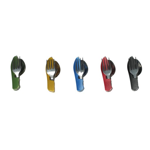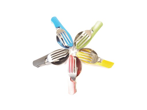Ten poręczny scyzoryk zawiera w sobie komplet sztućców - łyżkę, widelec i nóż wraz z otwieraczem do butelek i konserw. Składa się z dwóch części spajanych ze sobą za pomocą zaczepu (trzpienia do mimośrodu):I - widelec,II - łyżka i nóż z otwieraczem.