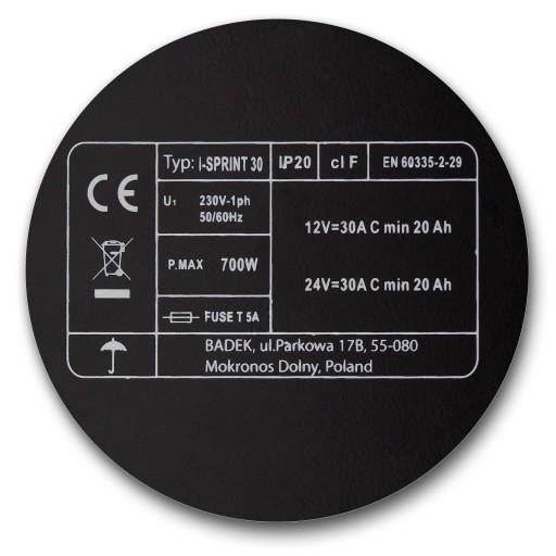 Napięcie akumulatora: 12 / 24 V | Dwa stopnie ładowania | Pojemność akumulatora: 20 - 300 Ah | Prąd ładowania: 30A | Zasilanie: 230V