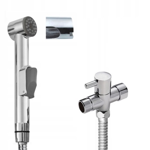 Wygodny zestaw bidetta z zaworem do zimnej wody, uchwyt rączki w dogodnym miejscu. Montaż DIY np. na zasileniu wody do kompaktu WC.