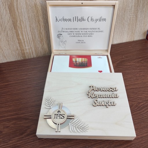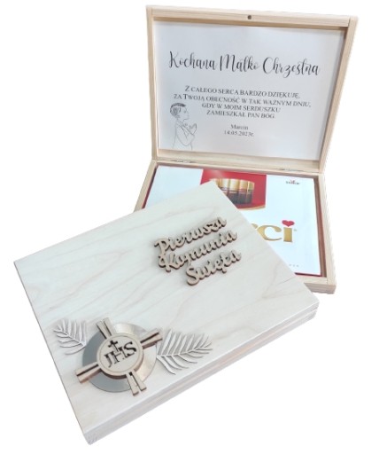 - Pudełko na wierzchu posiada wycięty ze sklejki napis: Pierwsza Komunia Święta, znak IHS z ozdobnymi listkami