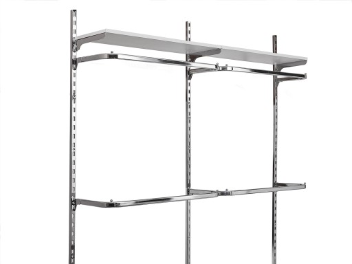 Opis: Garderoba dwumodułowa to funkcjonalny mebel do zastosowania w sklepach odzieżowych i domowej garderobie. Konstrukcja oparta na systemie profili ściennych. Rozmieszczenie wieszaków na szynach można dowolnie konfigurować. Ogromną zaletą tego systemu jest jego uniwersalność, wyposażenie można wymieniać na inne elementy (półki, wieszaki itp) w zależności od pojawiających się potrzeb. Szyny przymocowane do ściany stanowią solidną podstawę dla wieszaków. Mebel łatwy w montażu. Można powiększać o kolejne moduły.