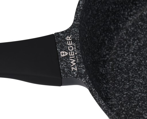 Patelnia ZWIEGER z odlewanego aluminium. Nowoczesna, niemiecka, nieprzywierająca powłoka granitowa GREBLON® pokrywa wewnętrzną część naczynia. Dzięki nowatorskiej technologii, pozwalającej zredukować ilość powłok do trzech warstw, patelnia doskonale przewodzi i akumuluje ciepło. Ze względu na swoje wyjątkowe właściwości, zwiększające odporność na zarysowania, powłoka GREBLON® stosowana jest w naczyniach najwyższej klasy. Dodatkowo, żaroodporny lakier silikonowy, który pokrywa patelnię, sprawia, że zachowuje ona swój estetyczny wygląd na długo.