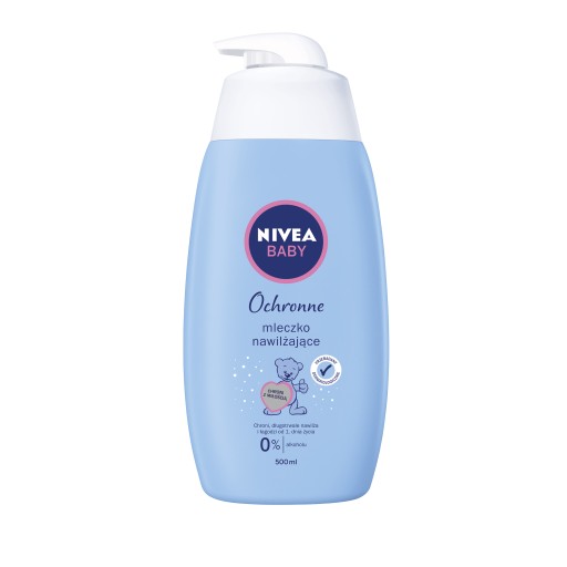 NIVEA BABY Ochronne mleczko nawilżające Chroni, długotrwale nawilża i łagodzi delikatną skórę dziecka już od 1. dnia życia. Dzięki formule wzbogaconej wyciągiem z aloesu chroni, długotrwale nawilża i łagodzi delikatną skórę dziecka. Szybko się wchłania zapewniając uczucie komfortu Przywraca właściwy poziom nawilżenia skóry. Produkt powstał przy współpracy pediatrów i dermatologów. Formuła stworzona tak, aby zapewnić wysoką tolerancję dla delikatnej i wrażliwej skóry niemowląt i dzieci. Bez alkoholu etylowego. Rekomendowany przez Instytut Centrum Zdrowia Matki Polki