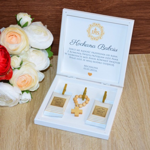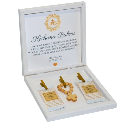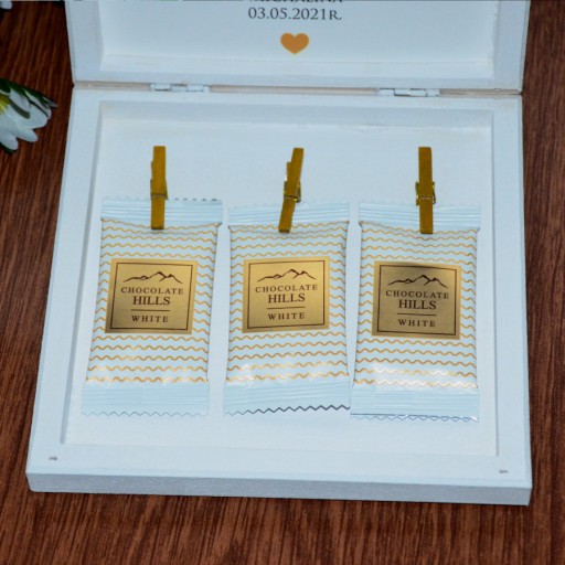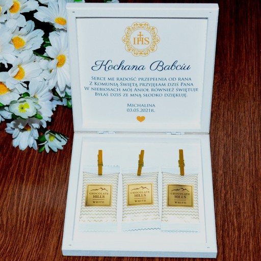 - Pudełko na wierzchu posiada ozdobny, pamiątkowy nadruk uv lub grawer