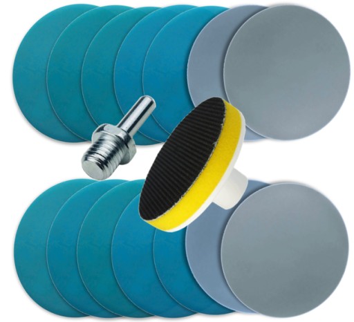 ZESTAW KRĄŻKÓW ŚCIERNYCH WODNYCH Z MOCOWANIEM NA RZEP 75mm + MIĘKKI DYSK NA RZEP + ADAPTER M14