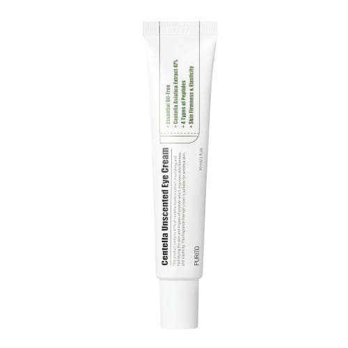 Purito Centella Unscented Eye Cream bezzapachowy krem do pielęgnacji skóry w okół oczu. Oparty na bazie wyciągu z wąkroty azjatyckiej i peptydów. Krem łatwo rozprowadza się na skórze, pomaga zmniejszyć widoczność zmarszczek. Formuła została pozbawiona zapachów i olejków eterycznych. Zawiera:
