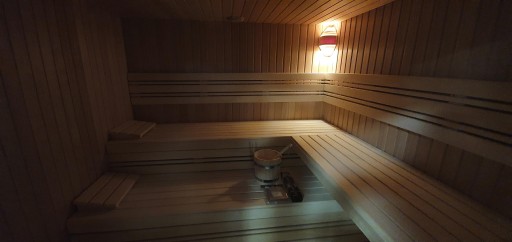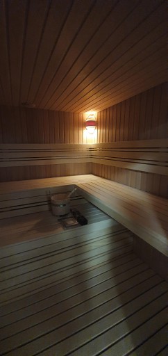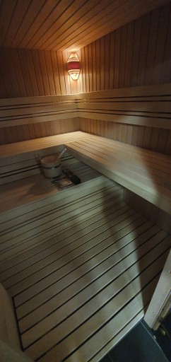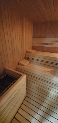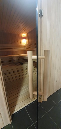 Sauna wykonana z boazerii jodły kanadyjskiej (hemlock) w klasie A grubości 12,5mm. Ściany grubości 65mm, ocieplone wełną mineralną 50mm. Drzwi pełno-szklane, bez progowe, przyciemniane w kolorze brązu. Ławki, obudowa pieca, oparcia, podest, zagłówki wykonane z nienagrzewającego się drewna abachi.