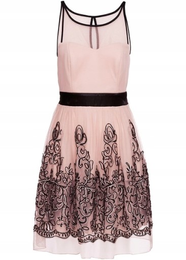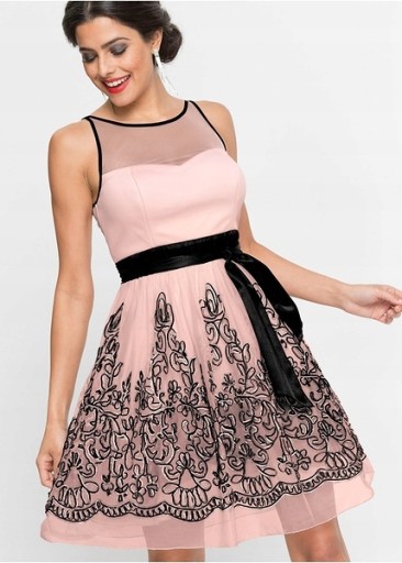 Przygotuj się na deszcz komplementów! Piękna sukienka koktajlowa przekonuje swoim efektownym designem, z siatkową wstawką w dekolcie i pięknym wzorem w dolnej części. Ślicznie się prezentuje.