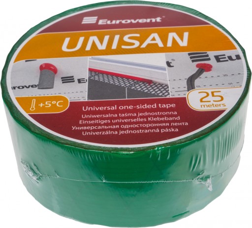 Eurovent ® UNISAN specjalistyczna jednostronna ta śma zbudowana z folii PE wzmocnionej wł óknem poliestrowym i specjalnego kleju na bazie dyspersji akrylowej. Zastosowanie: szerokie, m. in. do sklejania i reperacji materia ł ów wykonanych z tworzyw sztucznych, np. folii i membran paroprzepuszczalnych, paroizolacyjnych oraz ich sklejania z drewnem i elementami metalowymi. Powierzchnie sklejanych elementów musz ą być suche i czyste. Temperatura aplikacji min./max.: +5 °C do +40°C.