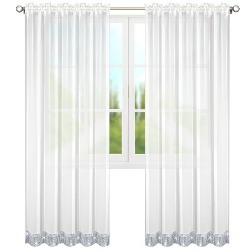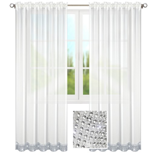 Oferujemy państwu firanę z białego woalu wykończona ozdobną taśmą z cyrkoniami, gotową do zawieszenia.