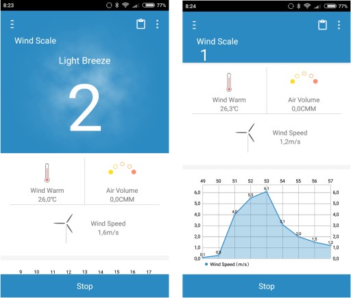 Aplikacja obrazuje na wykresie dane z rzeczywistego pomiaru prędkości wiatru. Pozwala także na powrót do danych w późniejszym czasie oraz kasowanie zbędnych pomiarów.