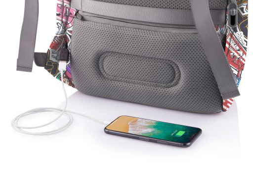 - Plecak wyposażony jest również w port USB do podłączenia powerbank’a oraz wykonany jest z materiału o zwiększonej odporności na wodę.