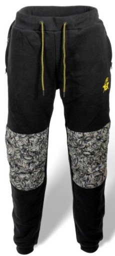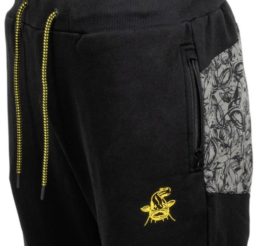 Wygodne joggery w stylowym wzorze Black Cat Design. Liczne małe sumy tworzą atrakcyjny wzór kamuflujący, który pasuje zarówno do wypraw nad wodę jak i codziennego noszenia.