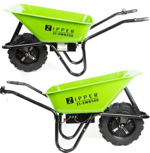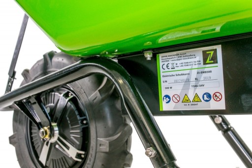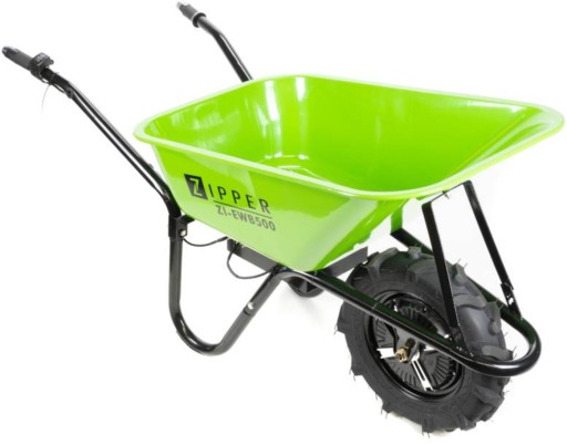 Taczka akumulatorowa o napędzie elektrycznym Zipper ZI-EWB500 z ładowarką w zestawie.