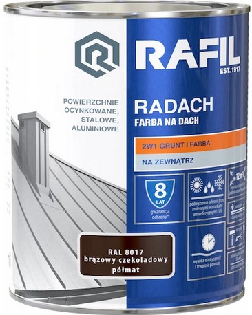 Wysokiej jakości gruntoemalia RADACH FARBA NA DACH przeznaczona jest do ochronno-dekoracyjnego malowania zewnętrznych powierzchni metalowych: stalowych, ocynkowanych i aluminiowych. Farba stosowana jest zarówno do wykonywania nowych wymalowań, jak i renowacji starych powłok malarskich. Charakteryzuje się doskonałą przyczepnością do podłoża. Tworzy szybkoschnące, wysoce elastyczne powłoki o podwyższonej odporności na działanie światła słonecznego, wody i innych czynników atmosferycznych. RADACH FARBA NA DACH zapewnia długotrwały efekt dekoracyjny malowanych powierzchni, a w zestawieniu z Rafil PODKŁAD ANTYKOROZYJNY stanowi silne zabezpieczenie przed korozją.