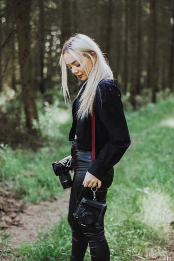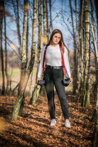 Szelki przeznaczone są dla jednego lub dwóch body. Skóra w kolorze CZERWONYM jest pochodzenia włoskiego, posiada piękną strukturę prawdziwej skóry licowej. Mocowanie aparatu odbywa się przez śrubę uniwersalną 1/4" oraz stalowy karabinek M5, natomiast rolę elementu przesuwnego po skórze pełni stalowy D-ring. Dodatkowym zabezpieczeniem aparatu przed wypięciem jest niezwykle wytrzymała 10mm taśma spięta karabinkiem M4. Długości pasów regulujemy za pomocą szeregu otworków natomiast rozłożenie splotu na plecach za pomocą nabijanego maszynowo nita.