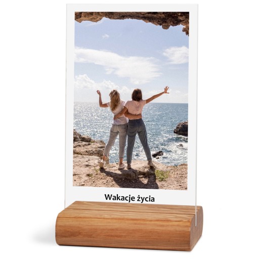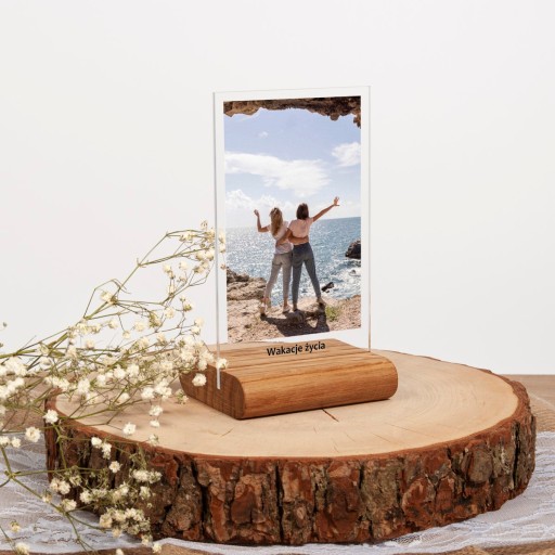 Na tabliczce ze stojakiem w kolorze naturalnego drewna możesz umieścić własne zdjęcie oraz tekst.