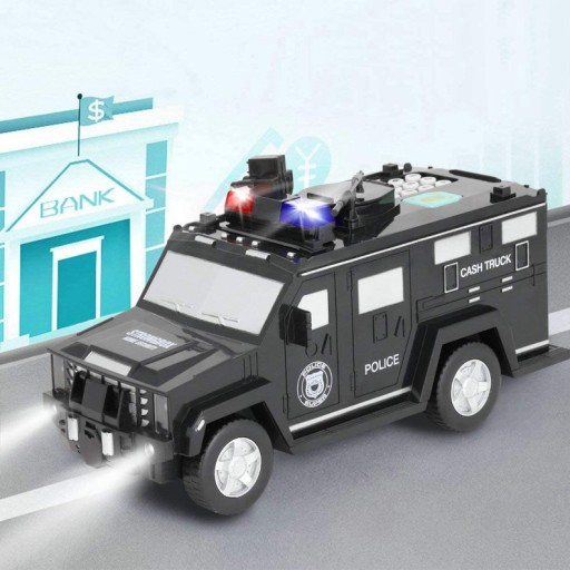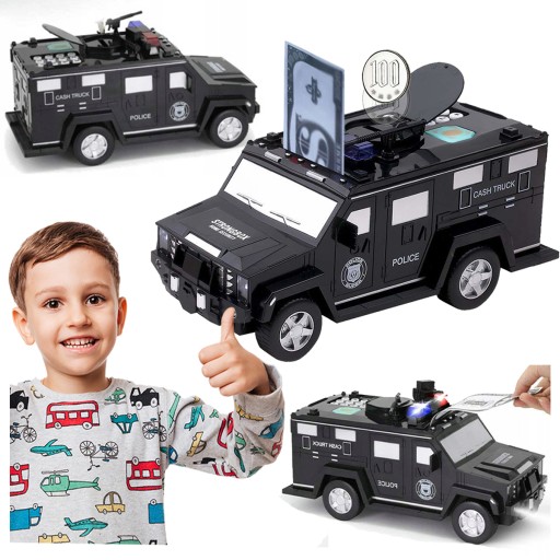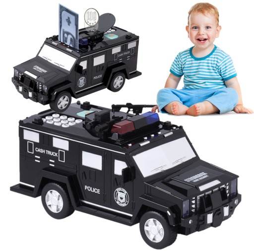 Przedstawiamy Państwu skarbonkę w kształcie samochodu policyjnego z elektronicznym kodem! Dzięki niej Twoje dziecko nauczy się oszczędzania oraz planowania wydatków. Skarbonka przyjmuje automatycznie papierowe pieniądze oraz monety. Wystarczy, że przyłożysz banknot do wlotu, a sejf pobierze pieniążek automatycznie! Posiada również zabezpieczenie przed otwarciem w postaci pinu, a także imitację czytnika linii papilarnych.