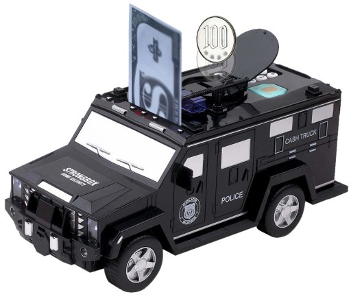 Skarbona w formie samochodu policyjnego dział jak sejf - otwiera się na kod PIN lub czytnikiem linii papilarnych