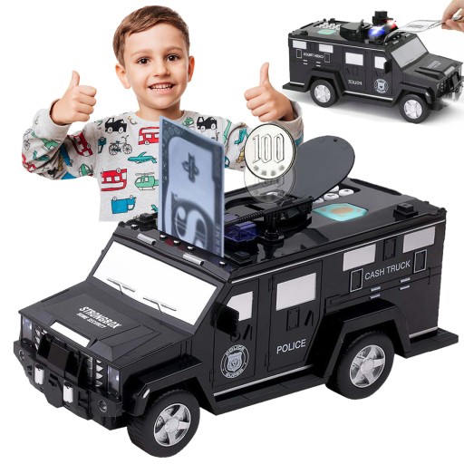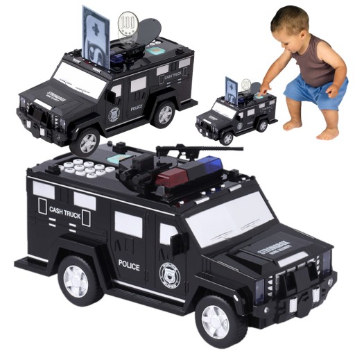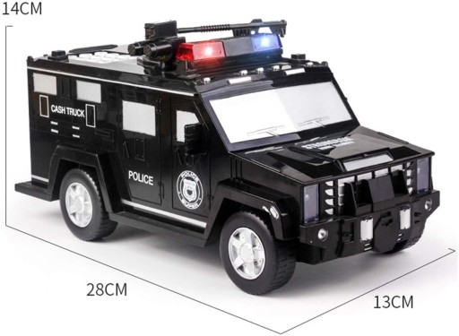 ⏩ Doskonała i bezpieczna forma oszczędzania dla Twojego dziecka. ⏩ Skarbonka imitująca samochód policyjny zabezpieczona kodem dostępu oraz czytnikiem linii papilarnych. ⏩ Wielorazowego użytku- po uzbieraniu kwoty na dany cel nie trzeba jej rozbijać jak tradycyjne.