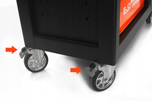 4 solidne kółka jezdne w tym 2 skrętne , ułatwiające manewrowanie szafką. Wózek warsztatowy jest wyposażony w mocny hamulec , za pomocą którego możemy zatrzymać szafkę w ustalonej pozycji.