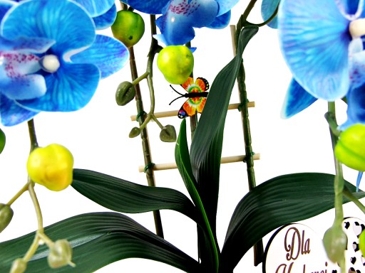 Ozdobna biała gałązka oraz sztuczny motylek sprawią iż nasz storczyk będzie wyglądał elegancko i bardzo naturalnie