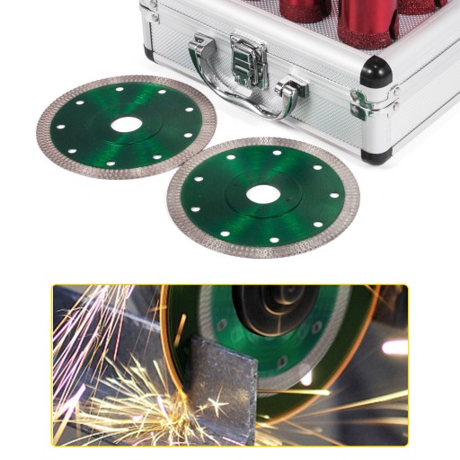 W zestawie narzędzi znajdują się również dwie ostre tarcze diamentowe o średnicy 125mm. Charakteryzują się ciągłą krawędzią, która umożliwia gładsze cięcie.
