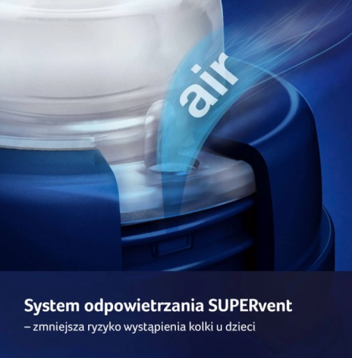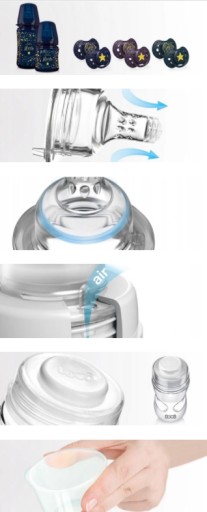 Zmniejsza ryzyko kolki. Zaworek odpowietrzający zapobiega zasysaniu i zapadaniu się smoczka, zmniejszając ryzyko wystąpienia kolki.