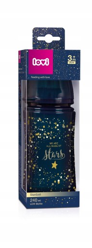Butelka do podawania odciągniętego mleka mamy. Ciemna kolorystyka butelki, wyróżnia się na rynku, a jednocześnie umożliwia kontrolowanie ilości mleka. Zdobiona w złote drobinki ,podkreślające unikalność kolekcji Stardust. Wyposażona w profesjonalny, miękki i dynamiczny smoczek, przez co jest bezpieczna dla dziecka karmionego piersią - nie zaburza odruchu ssania. Dynamiczna budowa smoczka wymaga od dziecka aktywnej pracy mięśni warg i języka. Jest kompatybilna z laktatorami LOVI.
