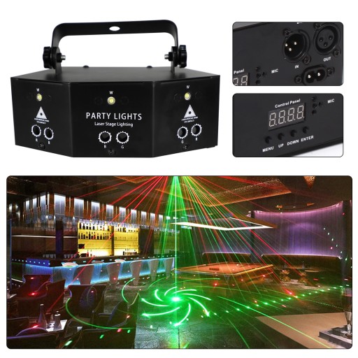 - Wybrane światła: Używamy doskonałego źródła światła LED oraz lamp PAR. Cała oprawa zawiera 6-laserowe i 3-białe otwory LED. To połączenie daje więcej olśniewającego i kolorowego światła. To 9-okowe laserowe stroboskopijne światło oferuje sieć światła wiązki, efekt breakpoint, efekt złamanego długopisu i inne 12-opcje do wyboru, dzięki czemu może spełnić scenę, DJ i wiele innych potrzeb.