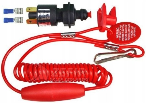 Zrywka bezpieczeństwa ze spiralką, karabińczykiem i stacyjką. Uniwersalne zastosowanie do wszelkiego rodzaju silników. Po wyjęciu zrywki lub wciśnięciu przycisku stacyjka przerywa obwód elektryczny lub go załącza (w zależności od podłączenia przewodów).