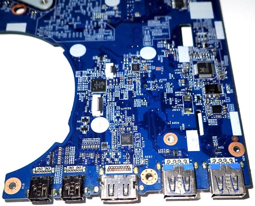 Stan: Uszkodzona, po podłączeniu do prądu ładuje baterię i zapalają się diody LED (patrz ostatnie zdjęcie). Po włączeniu przycisku POWER laptop na sekundę się włącza tj. zapala się na niebiesko przycisk POWER oraz podświetla się klawiatura i po 1 sekundzie laptop się wyłącza. Widać że kość BIOSU była lutowana (patrz zdjęcia). Poza tym żadnych śladów lutowania nie widać.