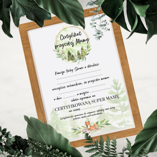 Na tej aukcji kupisz Test Kwalifikacyjny oraz Certyfikat Przyszłej Mamy w modnym motywie leśnym.