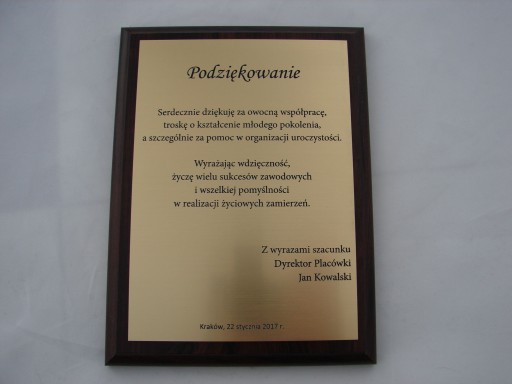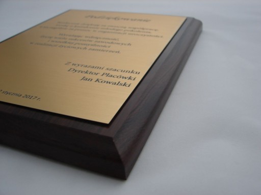 w eleganckiej formie graweru na złotym lub srebrnym delikatnym laminacie 0,8mm, zamocowanym na podkładzie drewnopodobnym z gotowymi dziurkami umożliwiającym zamocowanie na ścianie.