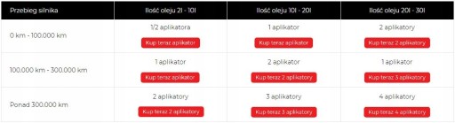 Wymagana ilość dozowań w zależności od liczby przejechanych kilometrów do ilości oleju mieszczącego się w misce olejowej.
