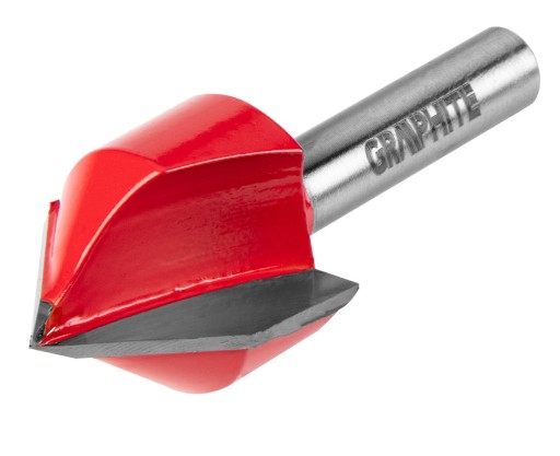 Frez do rowków typu V, HM, 25.4 x 25.4 mm, trzpień 8 mm GRAPHITE (nr ref. 56H210) przeznaczony do precyzyjnej obróbki m.in. drewna, PCV, płyt wiórowych przy pomocy frezarek górnowrzecionowych. Głowica wyposażona została w płytki skrawające wykonane z węglika spiekanego.
