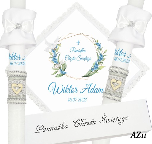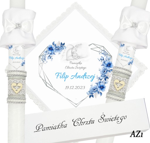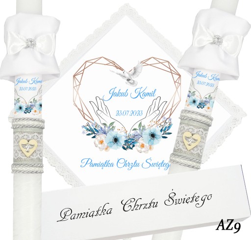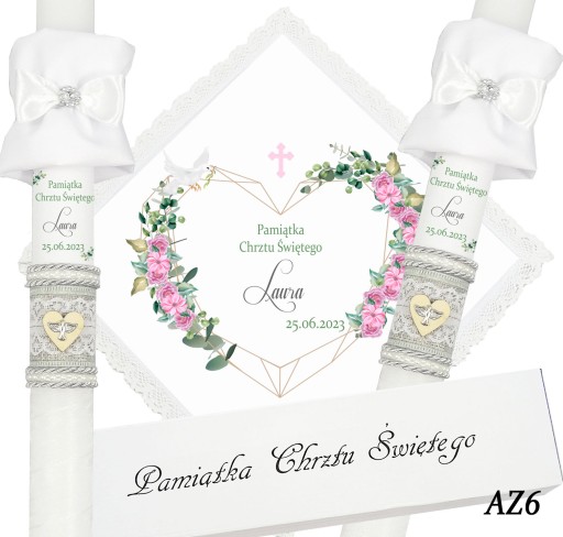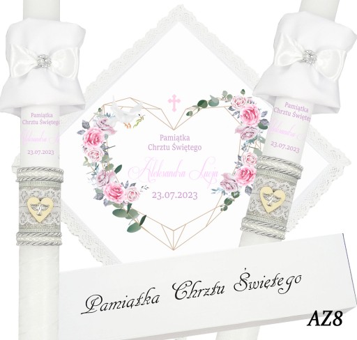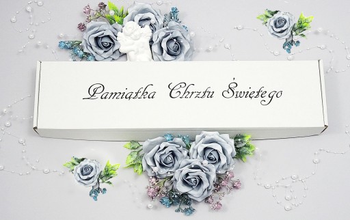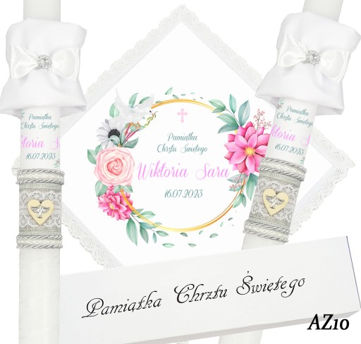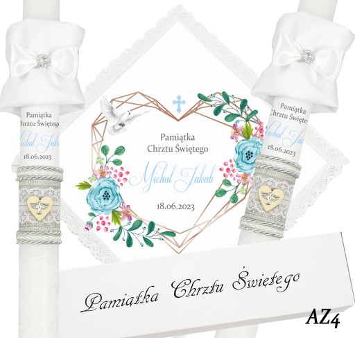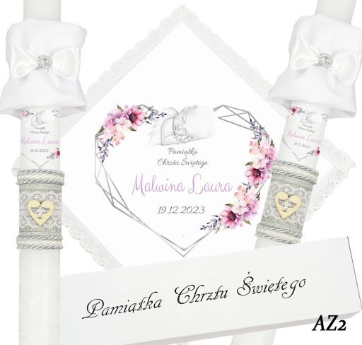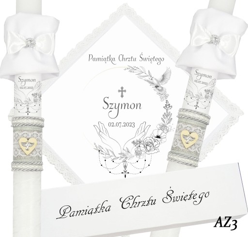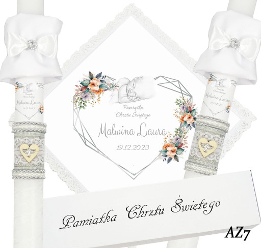 Prezentujemy niezwykły komplet szatki i świecy do chrztu, stworzony z myślą o uroczystym wydarzeniu w życiu każdego dziecka. Szatka wykonana jest z śnieżnobiałego materiału i obszyta bawełnianą koronką, co nadaje jej elegancji i delikatności. Świeca zdobiona jest ręcznie, a na niej umieszczony jest nadruk z imieniem dziecka, co sprawia, że jest to wyjątkowa i niepowtarzalna pamiątka. Świeca posiada srebrny sznurek, na jej powierzchni znajduje się szara jutowa wstążka wraz z koronką oraz drewniane serduszko,na którym znajduje się emblemat Ducha Świętego koloru srebrnego. Pozostała część świecy jest owinięta szyfonową białą wstążką. Wszystko to zapakowane jest w kartonowe białe pudełko z napisem "Pamiątka Chrztu Świętego", a do kompletu dodajemy jeszcze materiałową profitkę. Ten wyjątkowy zestaw szatki i świecy z pewnością podkreśli uroczystość chrztu i wzmocni emocje i wspomnienia związane z tą wyjątkową okazją.