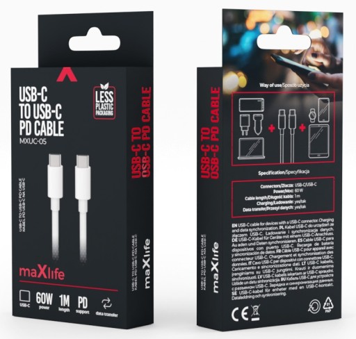 Kabel USB typ-C długości 1 metra marki maXlife umożliwia połączenie wielu urządzeń takich jak power bank, ładowarka, smartfon, laptop i inne tego typu w celu ładowania lub transmisji danych. Funkcja szybkiego ładowania (PD - PowerDelivery) pozwoli zaoszczędzić cenny czas. Wysokie maksymalne natężenie prądu (maks. moc 60W) pozwoli w szybki i bezpieczny sposób naładować podłączone urządzenia.