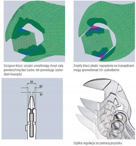 - Każde ze szczypiec-kluczy zastępuje wieloczęściowy zestaw kluczy metrycznych i calowych