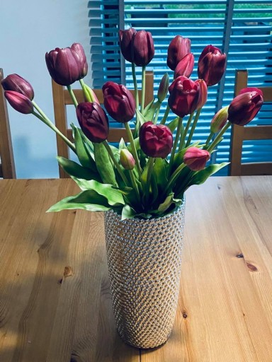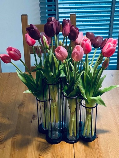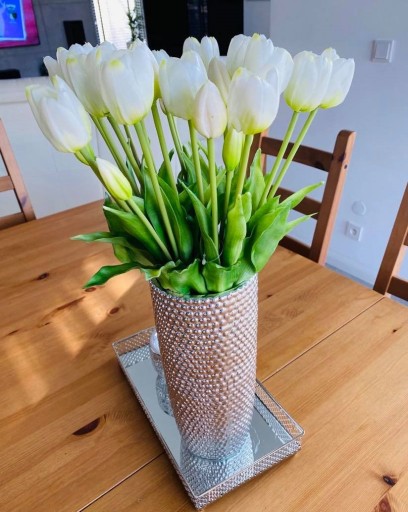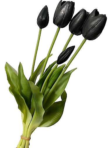 Bukiet wykonany z najwyższej jakości materiału, dzięki czemu tulipany wyglądają jak żywe. W każdym pęczku znajduje się 5 tulipanów w różnym rozkwicie, przewiązanych rafią. Długość tulipanów to aż 40 cm długości.