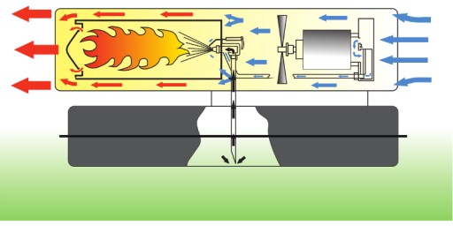 Zimne powietrze jest zasysane do urządzenia, a następnie przepływa w stronę wylotu nagrzewnicy i zostaje ogrzewane w komorze spalania. Paliwo jest pobierane ze zbiornika, po czym następuje jego wtrysk przez dyszę do komory spalania. W wyniku tego działania powstaje ciepło.