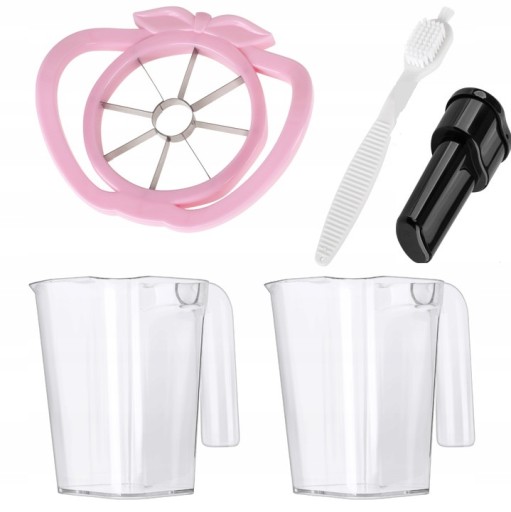 Wraz z urządzeniem w zestawie znalazły się 2 pojemniki – na sok oraz na miąższ, a także zwiększający wygodę użytkowania popychacz i ułatwiająca czyszczenie szczoteczka.