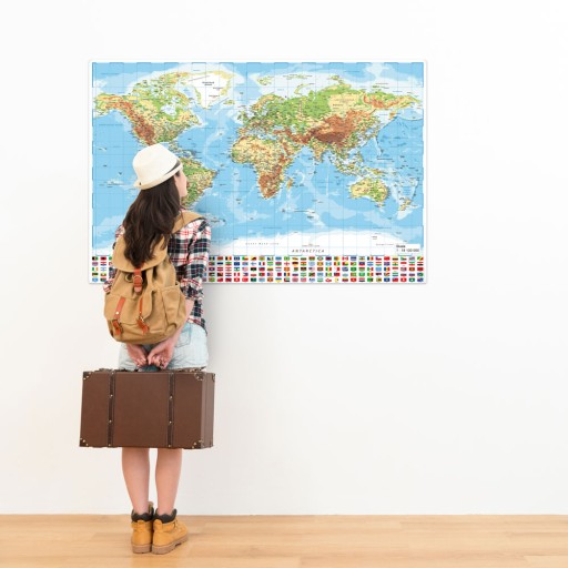 Duża MAPA ŚWIATA 144x102cm Ścieralna z samoprzylepnym Mocowaniem na ścianę
