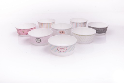 Miseczki sprzedawane są w zestawach po 30 sztuk. W każdym zestawie znajduje się mix wzorów i kolorów. Jednowarstwowe miseczki przyciągają uwagę swoimi wzorami i kolorystyką. Pastelowe kolory na zewnątrz kojarzone są z latem, słońcem, optymizmem i energią. Pozytywnie wpływają na wizerunek marki oraz na postrzeganie produktu znajdującego się wewnątrz opakowania.