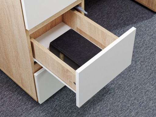 Dzięki swojej nietypowej konstrukcji zmieści się nawet w niewielkich pomieszczeniach, zapewniając tym samy dużo miejsca na uporządkowanie artykułów biurowych i komputerowych.