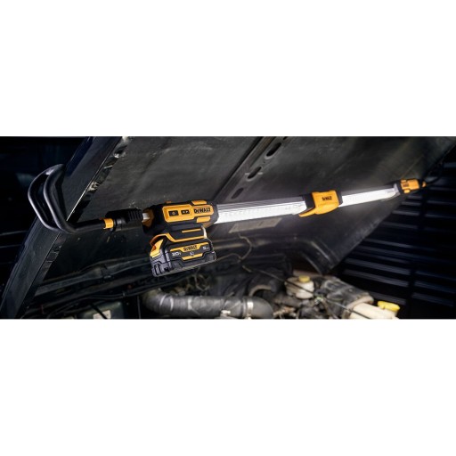 Akumulatorowa lampa podwieszana DeWALT DCL045 przeznaczona jest do warsztatów motoryzacyjnych. Latarka teleskopowa pozwala na montaż na masce samochodu. Regulowana długość w zakresie 1,3-1,9m z obrotowymi hakami 360°, pozwala dopasować się do większości samochodów. Bez ryzyka uszkodzenia maski dzięki zastosowaniu wyściełanych miękkim materiałem haków, zabezpieczają powierzchnię, do której przymocowana jest lampa. Podwieszanie źródła światłą pozwala na wygodna pracę w komorze silnika. Lampa posiada 2 tryb świecenia wysoki/niski - 1700/800lm. Z akumulatorem DCB184 (18V 5Ah) do 12 godzin nieprzerwanej pracy w trybie niskim świecenia oraz do 6 godzin w wysokim trybie. DCL045 jest w pełni kompatybilna z wszystkimi akumulatorami 12V XR, 18V XR oraz serią FLEXVLT 54V XR. Lampa składa się z 2 ramion świecących, którymi możemy sterować niezależnie, praca jednoramienna wydłuża maksymalny czas pracy.